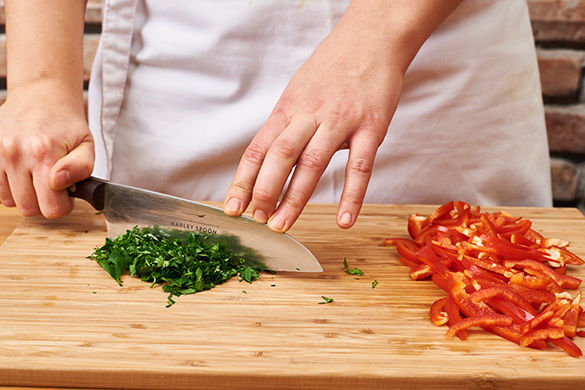 Die Petersilie samt Stängeln fein hacken. Die Paprika vierteln, entkernen und in dünne Streifen schneiden.
