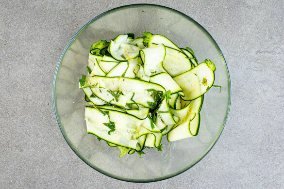 Die Zucchini mit einem Sparschäler rundum in lange, breite Streifen schneiden. Die Zitronenschale abreiben, dann die Zitrone halbieren und auspressen. Die Minzeblätter von den Stängeln zupfen und fein schneiden.