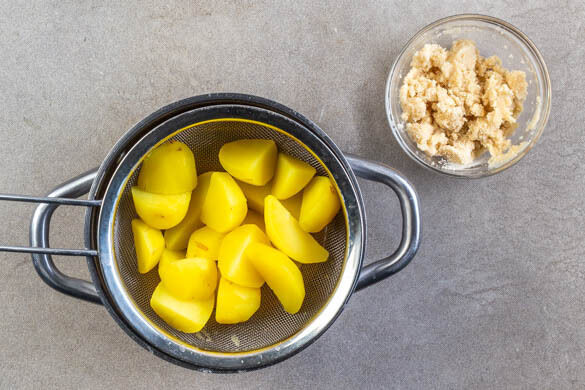 Die Semmelbrösel in einer Schüssel mit etwas Wasser bedecken und quellen lassen. Die Kartoffeln schälen, vierteln und im kochenden Wasser in 15–20Min. gar kochen. Anschließend in einem Sieb abtropfen lassen. Tipp: Um Zeit zu sparen, die Kartoffeln ungeschält vierteln und im letzten Schritt samt Schale stampfen.