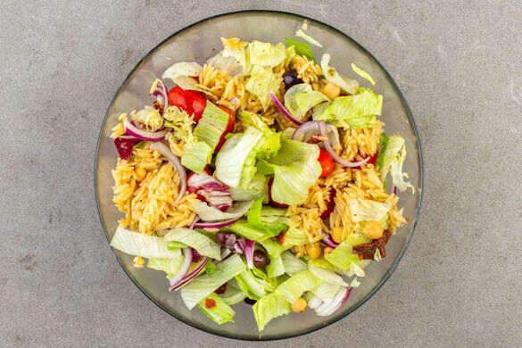 Die Zwiebeln in einem Sieb abtropfen lassen, dann mit dem Salat, den Kichererbsen, den getrockneten Tomaten, den Oliven, den Kirschtomaten und dem Dressing vermengen.