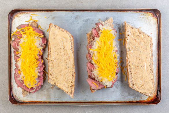 Das Fleisch in sehr dünne Tranchen schneiden und ausgetretenen Fleischsaft in den Mayonnaise-Dip rühren. Die Brötchen aufschneiden und beide Hälften jeweils mit dem Dip bestreichen. Die unteren Brötchenhälften mit dem Fleisch, dem Sauerkraut und dem Käse belegen. Die Sandwichhälften noch nicht schließen und offen 3–5Min. im Ofen backen.