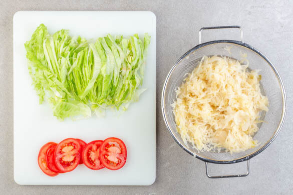 Das Sauerkraut in einem Sieb abtropfen lassen. Die Tomate in dünne Scheiben schneiden. Den Eisbergsalat halbieren und eine Hälfte in dünne Streifen schneiden. Den übrigen Salat für eine andere Verwendung aufbewahren.
