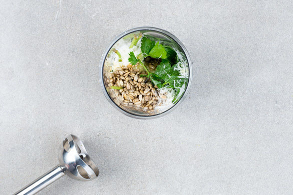 Die Sonnenblumenkerne in einer mittelgroßen Pfanne bei mittlerer Hitze ohne Zugabe von Fett 1–2Min. anrösten, dann aus der Pfanne nehmen. Den Käse fein reiben. Das Basilikum und die Petersilie samt Stängeln grob schneiden und mit den Sonnenblumenkernen, dem Käse, 2EL Olivenöl, 1–2EL Wasser sowie je 1 Prise Salz und Pfeffer in einem hohen Gefäß zu einem Pesto pürieren.