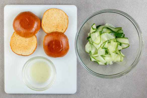 Die Brötchen im Ofen 3–5Min. aufbacken. Die Zitrone halbieren und auspressen. Die Gurke mit einem Sparschäler rundherum abschälen. Die Gurkenstreifen mit 2TL Zitronensaft und Salz würzen.