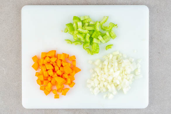 Den Backofen auf 240°C (220°C Umluft) vorheizen. Die Zwiebeln schälen und fein würfeln. Die Karotten ggf. schälen, längs halbieren und in 1–1,5cm dicke Scheiben schneiden. Den Sellerie grob würfeln.