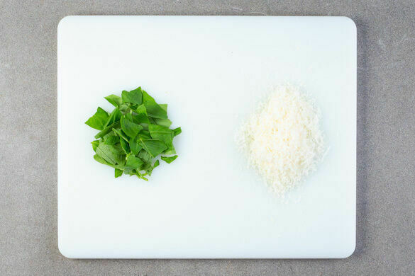 Inzwischen den Käse fein hacken. Die Basilikumblätter abzupfen und grob zerrupfen.