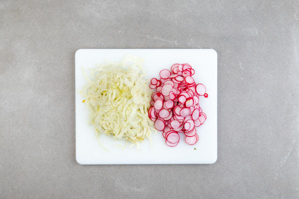 Den Fenchel halbieren und in möglichst dünne Streifen schneiden, dabei den Strunk entfernen. Die Radieschen in dünne Scheiben schneiden.