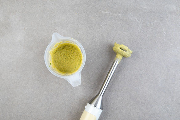 Die Kichererbsen mit ca. 2/3 der Petersilie, dem restlichen Knoblauch, 1EL Limettensaft, 1EL Olivenöl, 2–3EL Wasser sowie Salz und Pfeffer nach Geschmack in einem hohen Gefäß mit einem Stabmixer zu einem cremigen Hummus pürieren. Ggf. mehr Wasser bis zur gewünschten Konsistenz dazugeben.