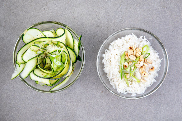 Zartes Kabeljaufilet gibt es heute mit einem leichten Salat aus dünnen Zucchinischeiben, lockerem Basmatireis, der mit Cashews und Lauchzwiebeln verfeinert wird, und gegrillter Paprika. Das nennen wir gesunde Feierabendküche ohne Reue mit kompromisslos viel Geschmack!