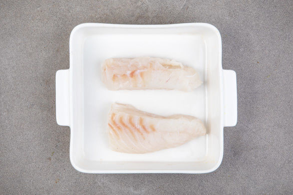 Den Backofen auf 140°C Umluft (160°C Ober-/Unterhitze) vorheizen. Den Fisch mit etwas Küchenkrepp trocken tupfen und ggf. Gräten mit einer Pinzette entfernen oder später beim Essen darauf achten. Die Fischstücke in eine Auflaufform legen.