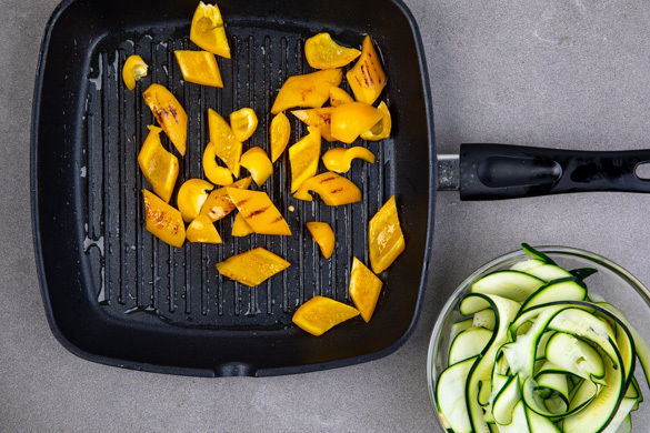Die Zucchini der Länge nach mit einem Sparschäler in dünne Streifen schneiden, das Kerngehäuse aussparen. Die Zucchinistreifen mit 1 Prise Salz vermengen und beiseitestellen. Die Paprika vierteln, entkernen und in 2–3cm lange Rauten schneiden. Mit 1–2EL Olivenöl vermengen und in einer Grillpfanne bei starker Hitze 2–3Min. rundum anbraten.