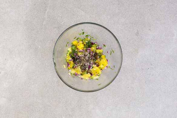 Die Limettenschale abreiben, dann die Limette halbieren und auspressen. Die Ananas in ein Sieb abgießen und fein würfeln. Die Korianderblätter abzupfen und fein schneiden. Die Zwiebelwürfel, die Ananas und den Koriander vermengen und die Salsa mit 1EL Limettensaft, 1/2TL Limettenschale sowie Salz abschmecken.