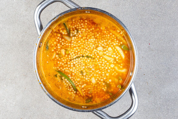 Den Perlencouscous, das Brühgewürz sowie 1/2TL Salz mit 1L gekochtem Wasser in den Topf geben und abgedeckt bei mittlerer Hitze 11–12Min. sanft köcheln lassen (bei Bedarf mehr Wasser hinzufügen), bis die Brühe aufgesaugt und der Perlencouscous gar ist. Ggf. ab und an umrühren, damit der Perlencouscous nicht ansetzt. Mit dem Zitronensaft sowie Salz und Pfeffer abschmecken.