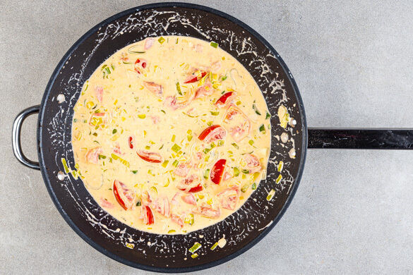 200ml Kochwasser in die Pfanne zu dem Gemüse geben und die Sauce ca. 2Min. köcheln lassen. Dann die Pfanne vom Herd nehmen und die Crème fraîche, die ½ des Trüffelöls sowie 3EL Zitronensaft einrühren und mit Salz und Pfeffer abschmecken.