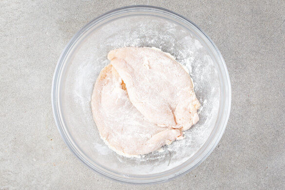 Das Fleisch trocken tupfen, horizontal halbieren und zwischen zwei Lagen Frischhaltefolie oder Backpapier mit einem Fleischklopfer oder dem Boden einer schweren Pfanne flach klopfen, bis das Fleisch 1–2cm dünn ist. Mit Salz und Pfeffer würzen und in 1EL Mehl wenden.