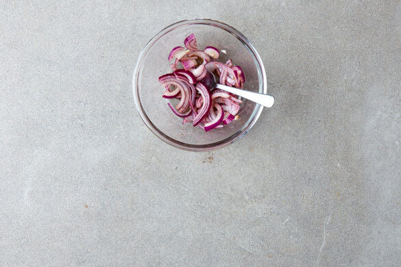 Die restlichen Zwiebeln mit 1EL Essig, ½TL Zucker und 1 Prise Salz vermengen.