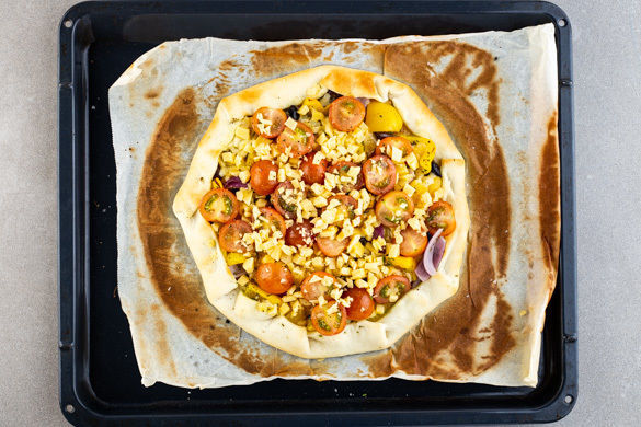 Den Teig gleichmäßig mit der Zwiebelmarmelade bestreichen und mit dem Gemüsemix belegen, dabei einen ca. 2–3cm breiten Rand aussparen. Den Teigrand über das Gemüse klappen. Tipp: Wer mag, kann 1 Eigelb verquirlen und den Teigrand damit bestreichen. Die Galette ca. 10Min. im Ofen backen.