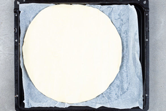 Den Backofen auf 190°C Umluft (210°C Ober-/Unterhitze) vorheizen. Den Teig mit dem Papier nach unten auf einem Backblech ausrollen.