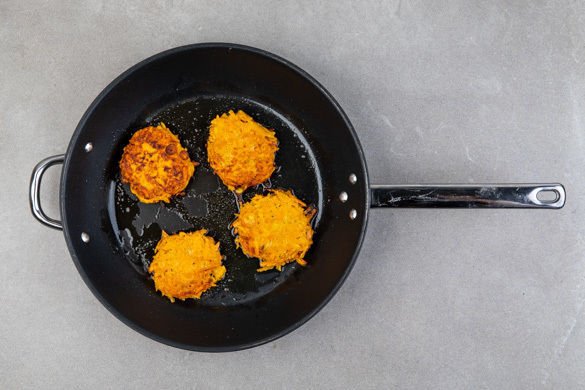 2EL Pflanzenöl in einer großen beschichteten Pfanne bei mittlerer Hitze erwärmen. 1EL Teig zu einer Kugel formen und in der Pfanne zu einer ca. 1cm flachen Rösti drücken. Von jeder Seite 3–4Min. ausbacken, bis die Rösti gar und goldbraun sind. So fortfahren, bis die Röstimasse verbraucht ist. Bei Bedarf mehr Pflanzenöl zugeben.