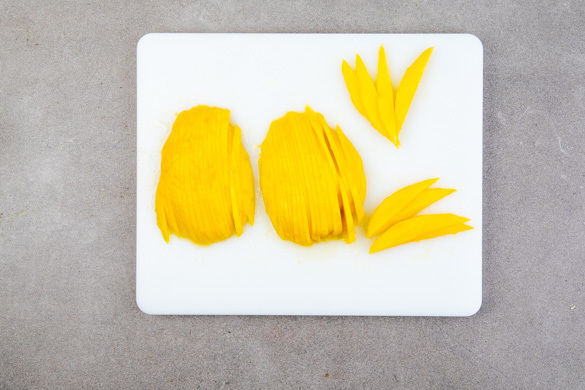 Inzwischen die Mangos schälen. Das Fruchtfleisch mit einem scharfen Messer an den Längsseiten dicht am Stein entlang abschneiden und in dünne Scheiben schneiden.