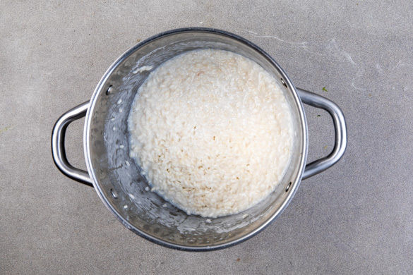 In einem mittelgroßen Topf 250ml Kokosmilch und 750ml Wasser mit 1–2TL Zucker zum Kochen bringen. Den Reis in einem Sieb unter fließendem Wasser abspülen, bis das Wasser klar bleibt. Den Reis in das kochende Kokoswasser geben und unter gelegentlichem Rühren in 20–22Min. cremig kochen.