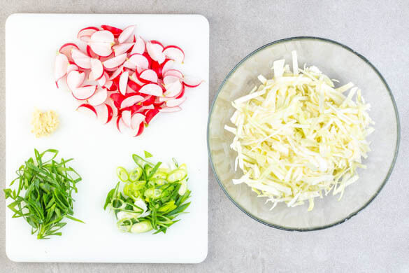 Den Kohl halbieren und eine Hälfte in feine Streifen schneiden, dabei den Strunk entfernen. Die Kohlstreifen mit ½TL Salz verkneten und beiseite stellen. Die Lauchzwiebeln schräg in feine Ringe schneiden, dabei die ½ der grünen Lauchzwiebelringe für den Radieschensalat aufbewahren. Die ½ des Ingwers schälen und fein reiben. Die Radieschen säubern und achteln.