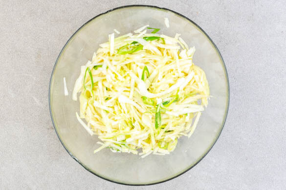 Die Kohlstreifen in einem Sieb abtropfen lassen und die überschüssige Flüssigkeit ausdrücken. Die Eier in die Schüssel aufschlagen und mit einer Gabel verquirlen. Die Kohlstreifen, das Sesamöl und 200ml Wasser untermengen. Den restlichen geriebenen Ingwer und die Lauchzwiebelringe unterheben.