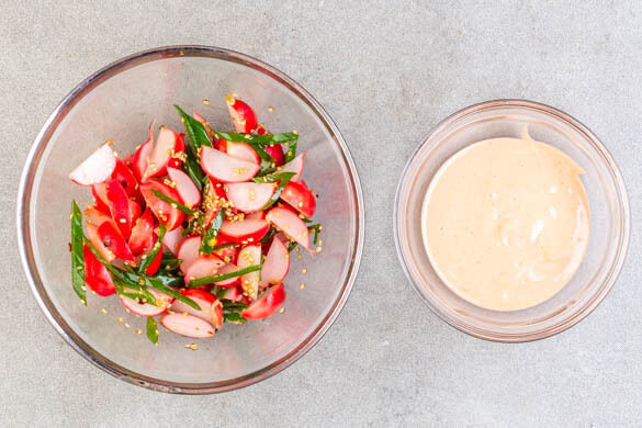 Inzwischen die Radieschen abgießen und mit den restlichen Lauchzwiebelringen, dem restlichen Sesam, 2EL Olivenöl sowie je 1 kräftigen Prise Zucker und Salz und ggf. 1 Prise Chiliflocken vermengen. 4EL Ketchup mit 4EL Mayonnaise zu einem Dip verrühren. Die Okonomiyaki auf Teller geben und mit dem Radieschensalat und dem Dip servieren.