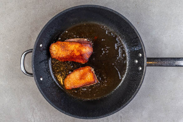 Inzwischen in einem zweiten kleinen Topf 300ml leicht gesalzenes Wasser für den Reis zum Kochen bringen. Das Fleisch trocken tupfen und ohne Zugabe von Fett mit der Hautseite nach unten in eine mittelgroße Pfanne legen. Bei mittlerer Hitze 10–11Min. sanft braten und dabei das Fett austreten lassen. Dann das Fleisch wenden und 7–8Min. weiterbraten, bis es gar ist.