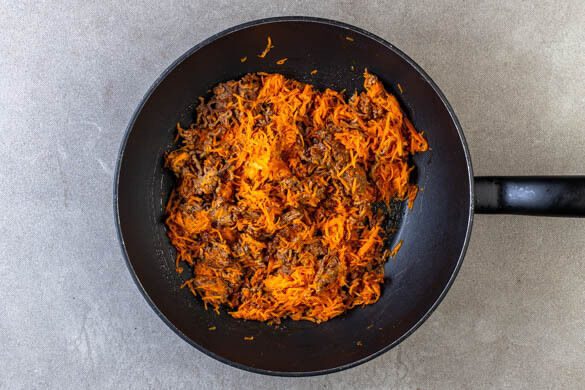 Die Karotten, die Sojasauce und die Knoblauch-Ingwer-Paste in den Wok bzw. die Pfanne geben und 2–3Min. mitbraten, bis die Karotten weich sind.