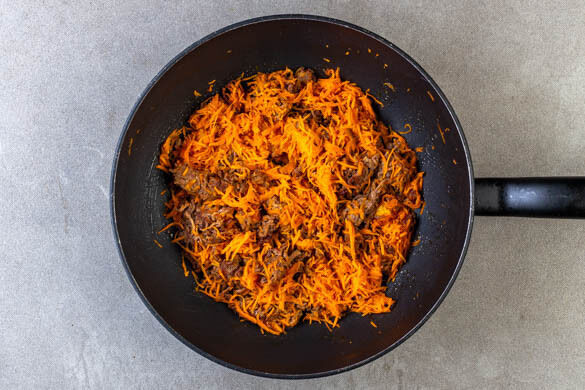 Die Karotten, die Sojasauce und die Knoblauch-Ingwer-Paste in den Wok bzw. die Pfanne geben und 2–3Min. mitbraten, bis die Karotten weich sind.