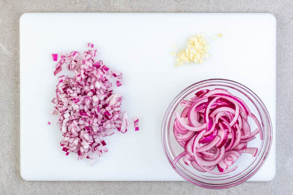 1EL Essig mit ½TL Zucker und 1 Prise Salz verrühren, bis sich Zucker und Salz aufgelöst haben. Die Zwiebel schälen und halbieren. Eine Hälfte in feine Ringe schneiden, mit der Essigmischung vermengen und mind. 15Min. marinieren lassen. Die übrige Zwiebelhälfte fein würfeln. Den Knoblauch schälen und sehr fein würfeln oder durch eine Knoblauchpresse drücken.
