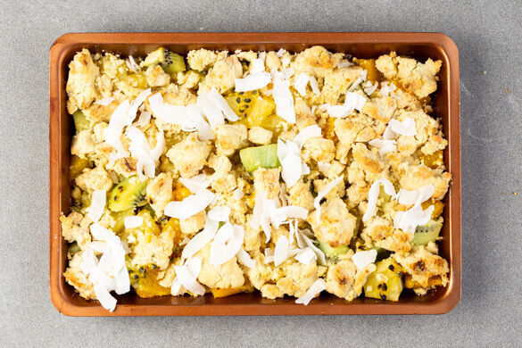 Den Crumble ca. 20Min. auf der mittleren Schiene im Ofen backen. Dann mit den Kokosraspeln bestreuen und weitere 1–2Min. backen. Aufpassen, dass die Kokosraspeln nicht zu dunkel werden!