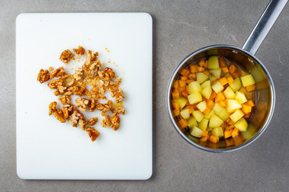 Die Kakis in kleine Würfel schneiden und mit den gegarten Äpfeln vermengen. Das Kompott mit Zitronenschale und -saft abschmecken und warm halten. Die Walnüsse grob hacken.