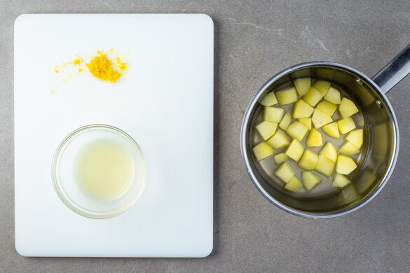 Die Zitronenschale abreiben, dann die Zitrone halbieren und auspressen. Die Äpfel schälen, entkernen und in ca. 2cm große Würfel schneiden. Mit 150ml Wasser und 2EL Zucker in den Nusstopf geben, zum Kochen bringen und 5–8Min. sanft köcheln lassen, bis die Apfelstücke weich sind.