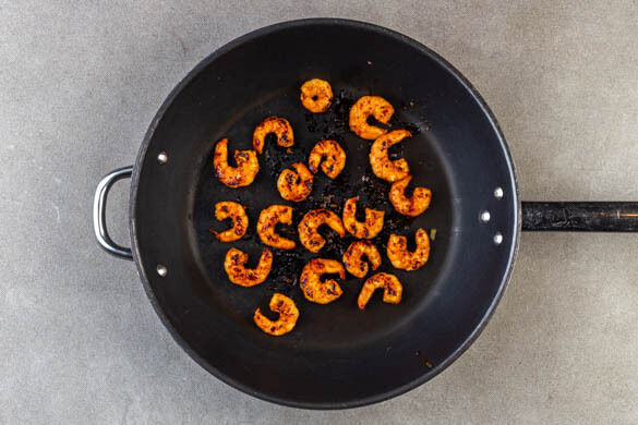 In einem kleinen Topf ausreichend gesalzenes Wasser für die Nudeln aufkochen. Die Garnelen in einem Sieb kalt abspülen und abtropfen lassen, dann mit der ½ des Sambal Badjak, 1 Prise Salz sowie 1EL Pflanzenöl vermengen und beiseitestellen.