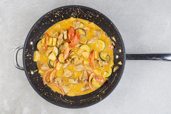 Was haben Ananas und Zucchini miteinander zu tun? Im Allgemeinen vielleicht nicht so viel, heute allerdings finden sie sich in trauter Einigkeit auf deinem Teller: Zusammen mit zartem Schweinefleisch und frischer Tomate sind sie die Stars in deinem kokoscremigen Curry! Ein bestimmtes Maß an Schärfe durch die aromatische Currypaste ist zwar vorgesehen, doch letztlich darfst du immer selbst entscheiden, wie weit du gehen willst.