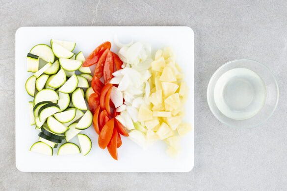 In einem mittelgroßen Topf 600ml leicht gesalzenes Wasser für den Reis zum Kochen bringen. Die Zucchini längs halbieren und quer in dünne Scheiben schneiden. Die Tomaten entkernen und in dünne Spalten schneiden. Die Zwiebeln schälen, halbieren und in dünne Streifen schneiden. Die ½ der Ananas in einem Sieb abtropfen lassen, dabei den Saft auffangen.