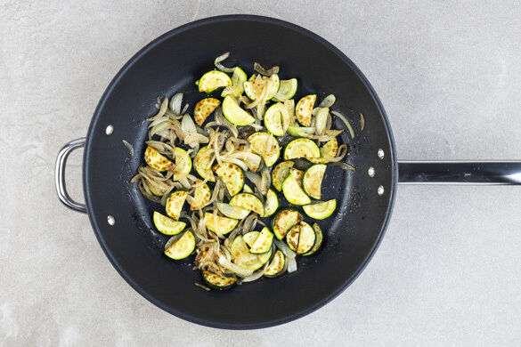 Die Zucchini und die Zwiebeln in einer großen Pfanne mit 1EL Pflanzenöl und 1 Prise Salz bei starker Hitze 3–5Min. braten, bis das Gemüse goldbraun und weich ist.