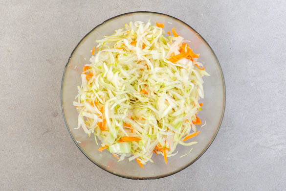 Einen großen Topf bis unter den Dämpfeinsatz mit Wasser füllen und das Wasser zum Kochen bringen. Tipp: Statt dem Dämpfeinsatz kann auch ein passendes Sieb verwendet werden. Die Karotte ggf. schälen und grob raspeln. In einer großen Schüssel mit dem Weißkohl, 2EL hellem Essig und ½TL Salz vermengen und 1–2Min. gut durchkneten, bis das Gemüse weicher wird.