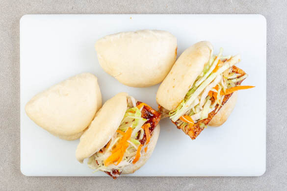 Fluffige Hefebrötchen oder Gao Baos sind so etwas wie die asiatischen Verwandten der Minitortillas: Sie eignen sich hervorragend dazu, mit Köstlichkeiten gefüllt zu werden und als Fingerfood für vergnügliche Genussmomente zu sorgen. Heute haben knackiger Weißkohlsalat mit Birne und gebratener Tofu mit zweierlei Sauce ihren großen Auftritt. Fix gemacht, schnell verputzt – guten Appetit!