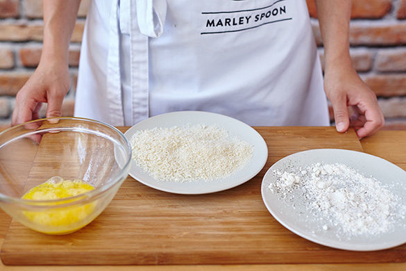 1–2EL Mehl auf einem Teller mit Salz und Pfeffer verrühren und gleichmäßig verteilen. Die Semmelbrösel auf einen weiteren Teller geben. 1 Ei verquirlen und bereitstellen.
