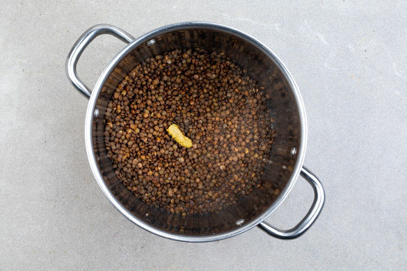 In einem großen Topf 2L Wasser zum Kochen bringen. Die Linsen in einem Sieb mit kaltem Wasser abspülen, in das kochende Wasser geben und einmal aufkochen lassen. Dann abgedeckt bei mittlerer bis niedriger Hitze 25–35Min. sanft köcheln lassen, bis die Linsen bissfest sind. Das Brühgewürz unter die gegarten Linsen rühren.