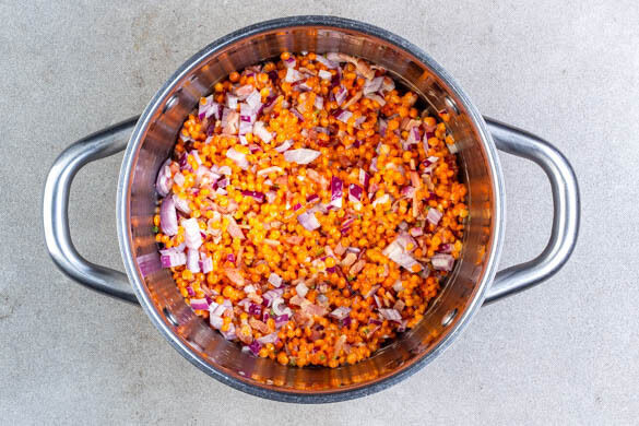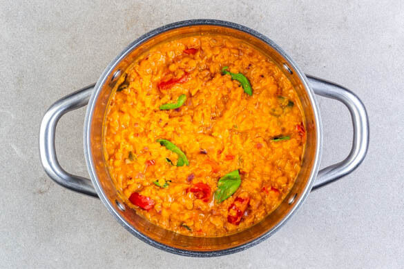 Herzhaft, aromatisch und voller Raffinesse: Unser Bacon-Linsen-Eintopf mit Kirschtomaten ist Soulfood pur. Saftiger Bacon verleiht dem cremigen Eintopf mit roten Linsen eine rauchige Note, während fruchtige Kirschtomaten für frische Leichtigkeit sorgen. Serviert auf duftigem Basmatireis, und mit Basilikum verfeinert, wird daraus ein sättigendes Wohlfühlgericht, das sich nicht nur sehen, sondern auch schmecken lässt.