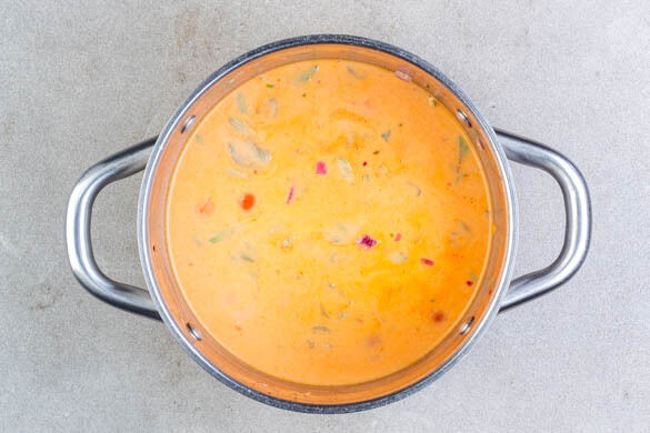 Die Kochsahne in den Topf geben und unter gelegentlichem Rühren 4–5Min. köcheln lassen, bis mindestens die Hälfte der Flüssigkeit verdunstet ist. Dann die Zwiebeln hinzugeben und ca. 2Min. kochen, bis sie weich sind.