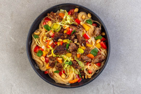 Lust auf eine Streetfood-Spezialität aus Südostasien? Dafür musst du nicht gleich einen Flug buchen – wir bringen dir diese Leckerei direkt nach Hause! Unsere bunte Bowl mit saftigem Rinderhackfleisch, buntem Gemüsemix, fruchtigen Tomaten und einem würzigen Hoisin-Limetten-Dressing mit Sojasauce wird superschnell und elegant auf Glasnudeln serviert und mit Koriander verfeinert. Guten Appetit!