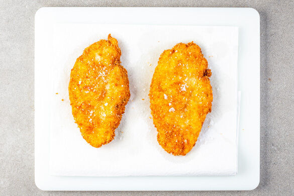 Das Fleisch trocken tupfen, jeweils horizontal halbieren und zwischen zwei Lagen Frischhaltefolie oder Backpapier mit dem Boden einer schweren Pfanne oder einem Fleischkloper flach klopfen, bis das Fleisch 1–2cm dünn ist. Mit Salz und Pfeffer würzen und in 2EL Mehl wenden.