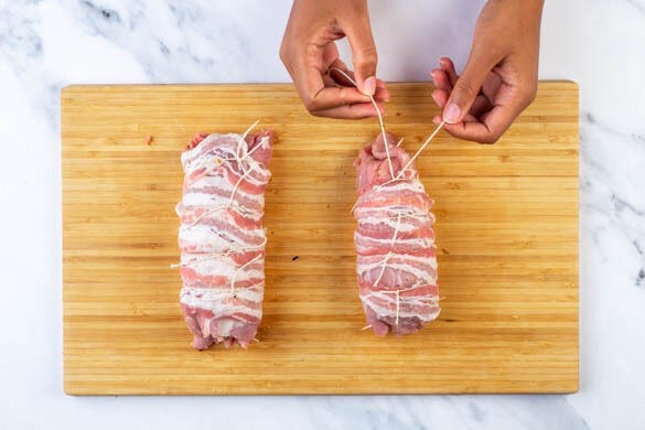 Das Fleisch trocken tupfen und mit einem scharfen Messer längs einschneiden, sodass es sich wie ein Buch aufklappen lässt. Das Fleisch aufklappen, mit Frischhaltefolie bedecken und z. B. mit dem Boden einer schweren Pfanne 2–3mm dünn flach klopfen. Die Baconscheiben leicht überlappend auf eine saubere Oberfläche legen und das Fleisch mittig darauf platzieren.