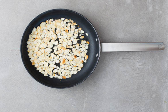 Die Mandeln in einer mittelgroßen Pfanne ohne Zugabe von Fett in 3–4Min. bei mittlerer Hitze goldbraun anrösten. Vorsicht, die Mandeln können schnell verbrennen. Zum Abkühlen auf einem Teller beiseitestellen.
