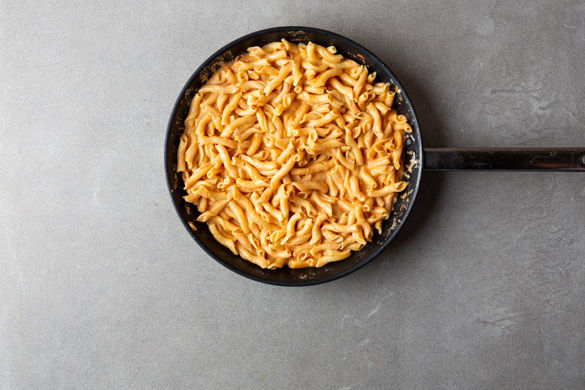 Den Backofen mit Grillfunktion oder Ober-/Unterhitze auf 250°C vorheizen. In einem mittelgroßen Topf ausreichend gesalzenes Wasser für die Pasta zum Kochen bringen. Die Pasta in das kochende Wasser geben und in 6–8Min. bissfest kochen. Mit einem Messbecher ca. 150ml Pastawasser abschöpfen, dann in ein Sieb abgießen und abtropfen lassen.